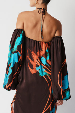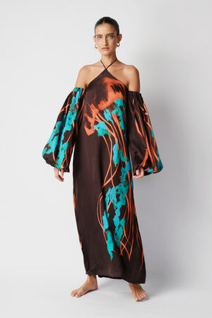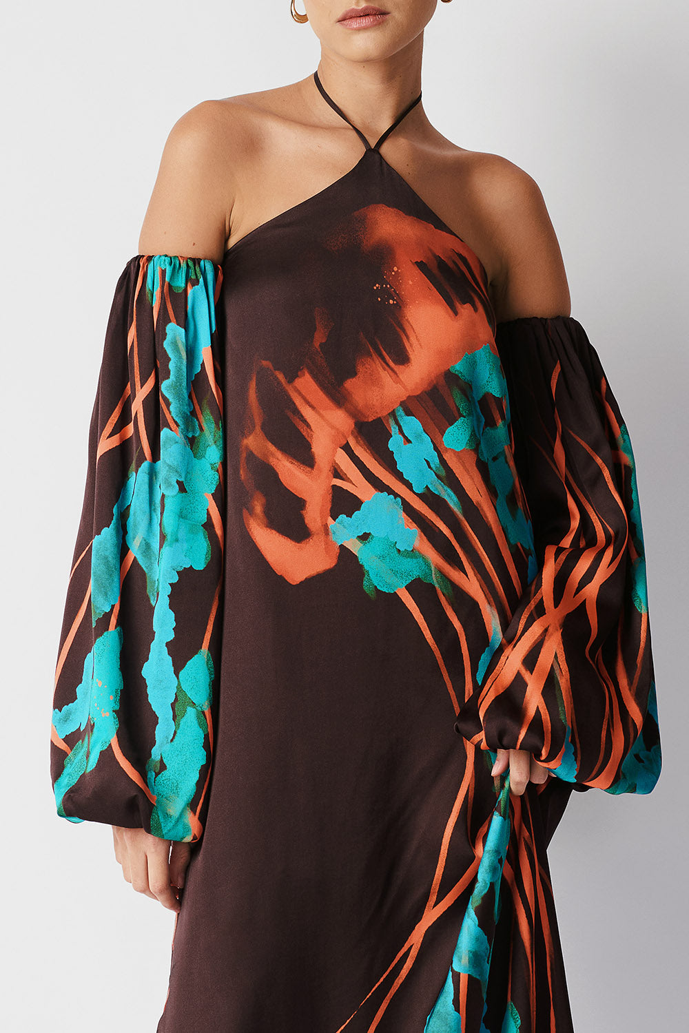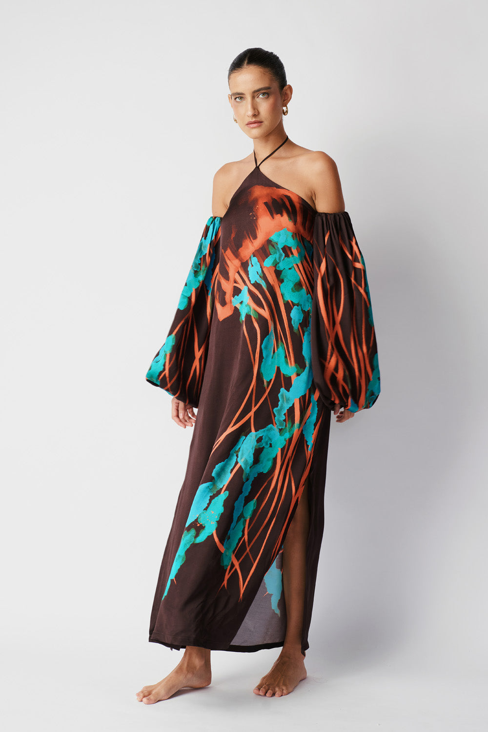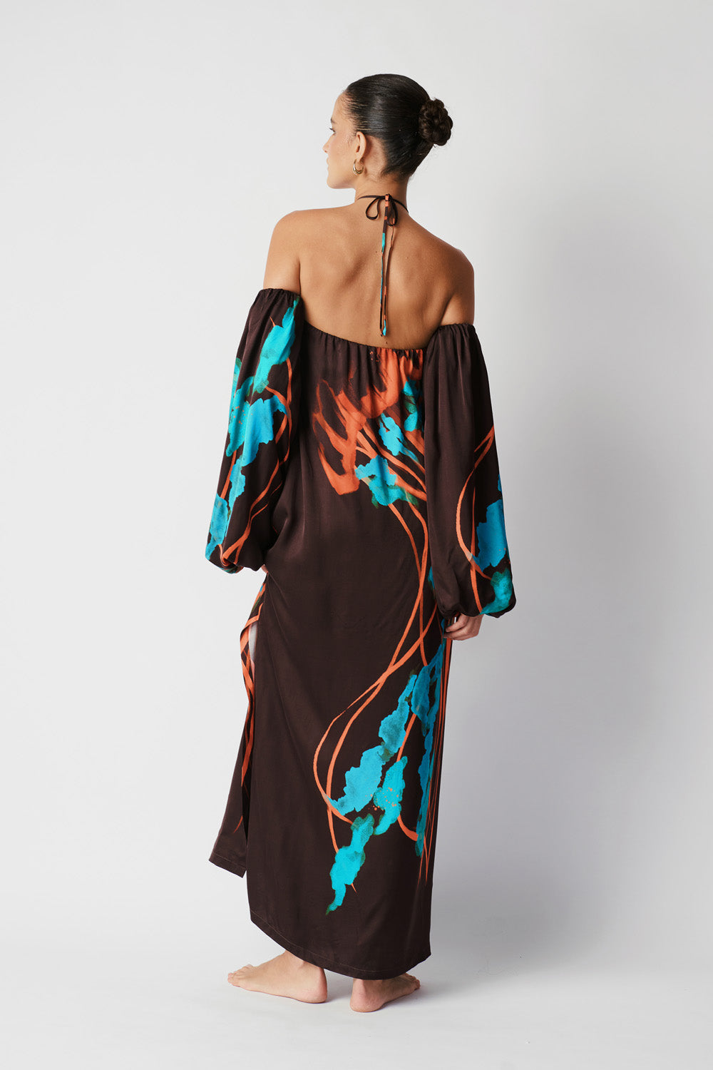 Vestido maxi fluido con mangas removibles. Cuenta con un escote asimétrico y tirantes ajustables para un ajuste personalizado.