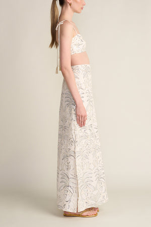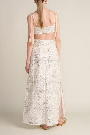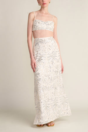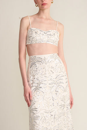 Top corto con forma de corazón, adornado en delicadas lentejuelas con bordados inspirados en motivos tropicales y tirantes delgados ajustables.