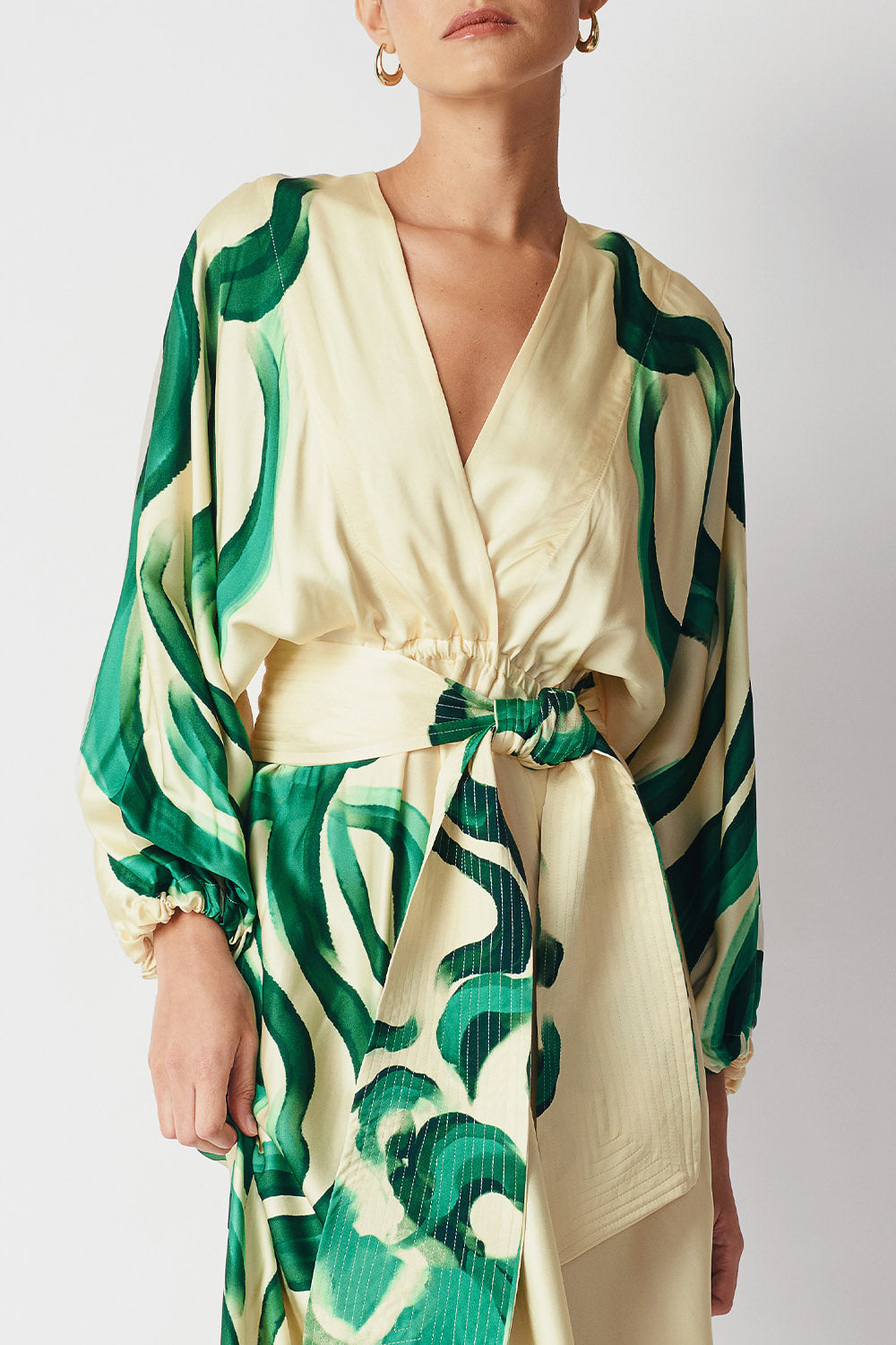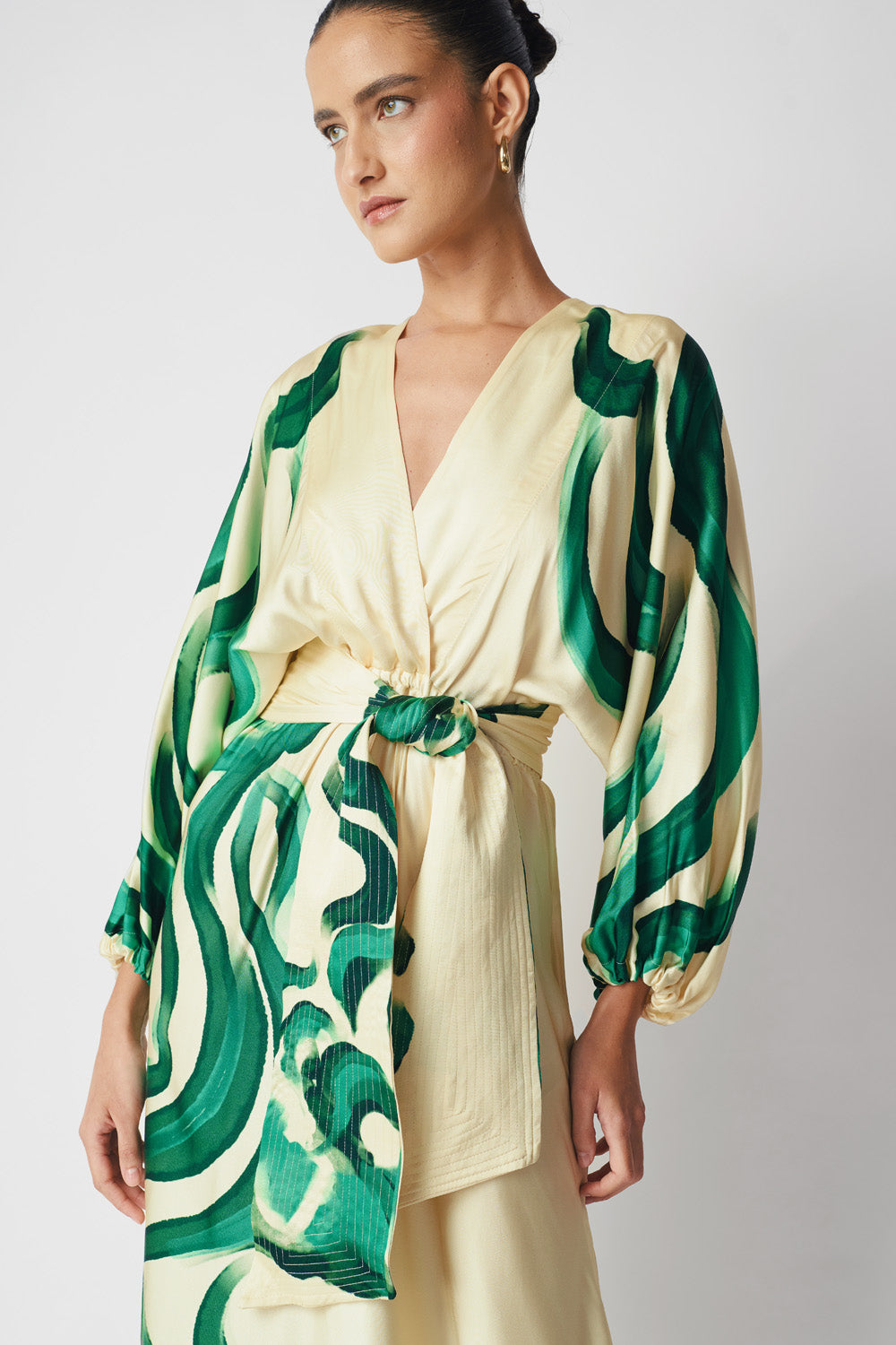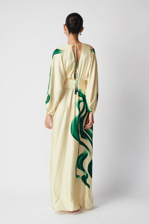 Elegante vestido maxi con escote en V, diseñado con una silueta fluida y mangas largas.