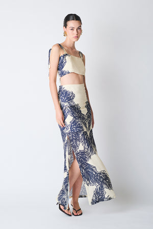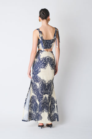Falda larga semi ajustada con abertura en laterales y cierre en parte trasera y forrada.