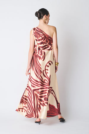 Vestido de silueta amplia, corte segado, de un solo hombro.