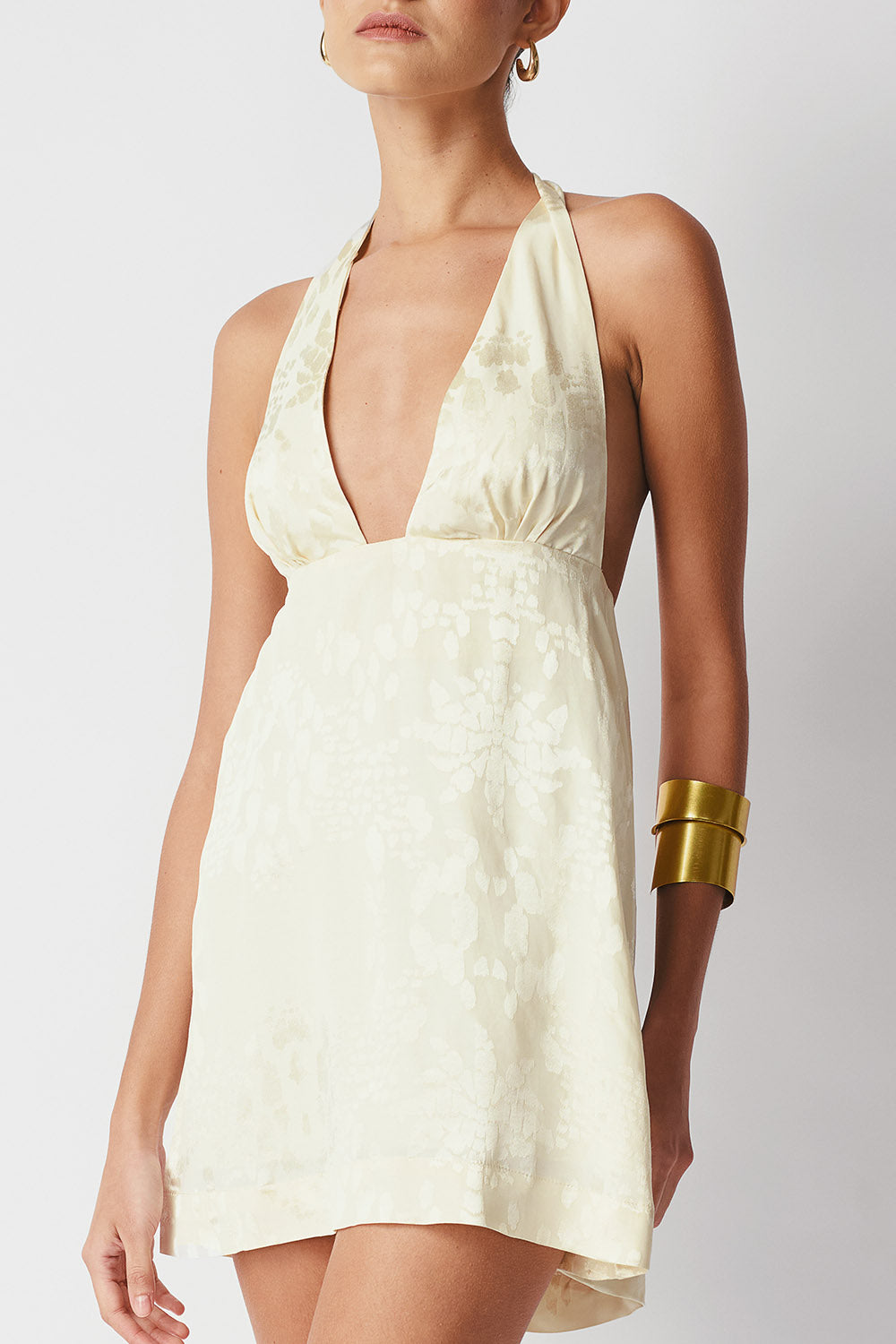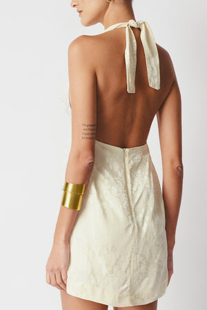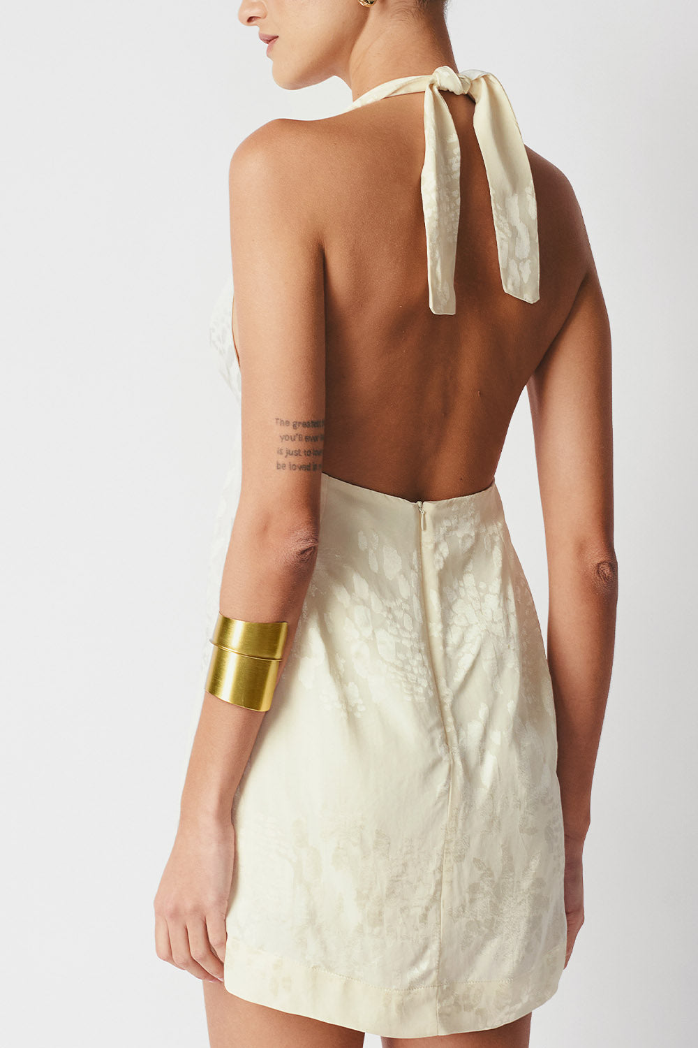 Vestido mini amarrado al cuello, cintura ajustada y falda acampanada.