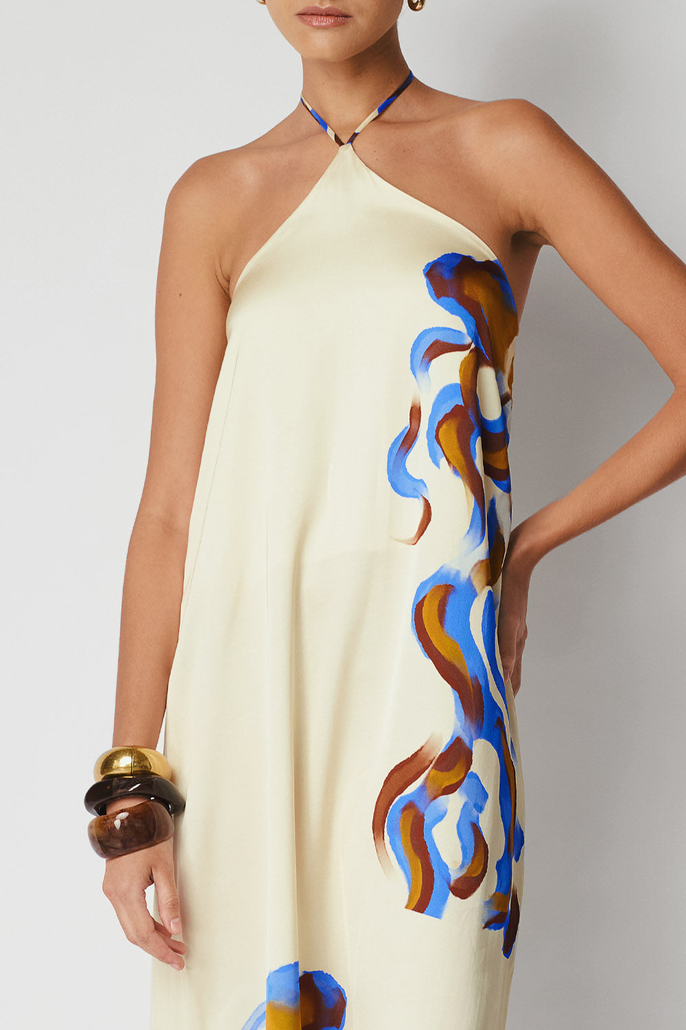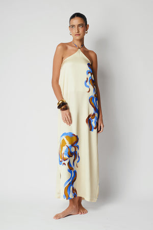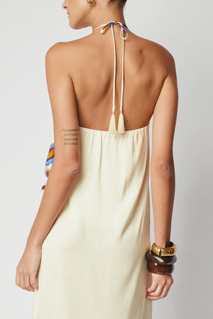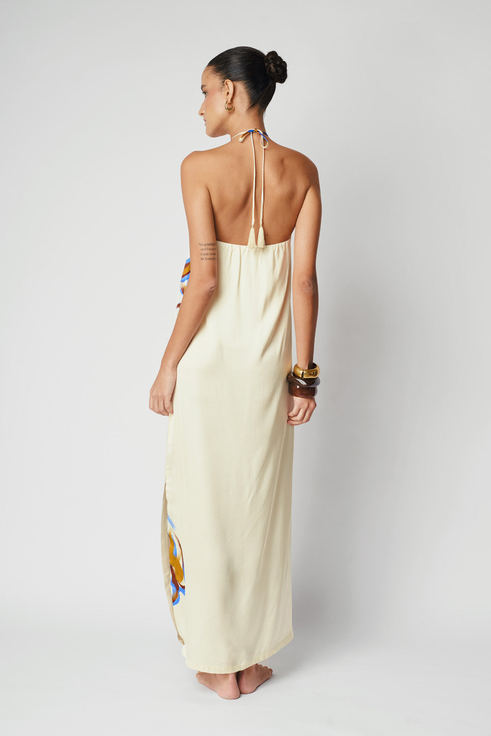 Vestido maxi halter, espalda abierta y delicados tirantes ajustables para un estilo elegante.