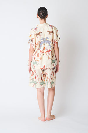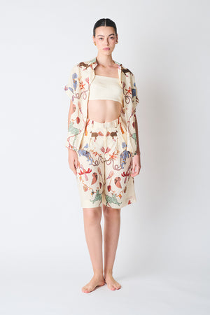 Bermuda talle alto con pretina, pliegues y cierre en delantero, con bolsillos y pasadores para correa.