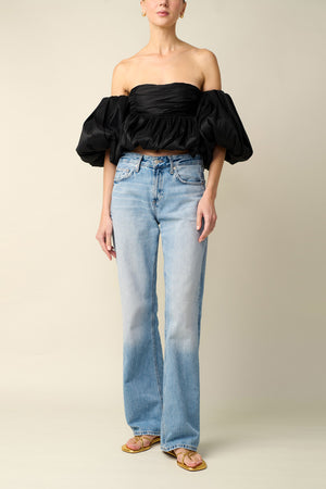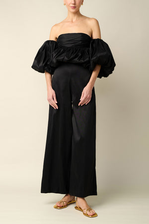 Top con escote de hombros descubiertos, que incluye mangas abullonadas removibles y un dobladillo peplum para un estilo sofisticado y elevado.