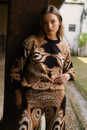 Top tejido en tonos tierra y negro. Silueta cómoda, sin cierres ni bolsillos.