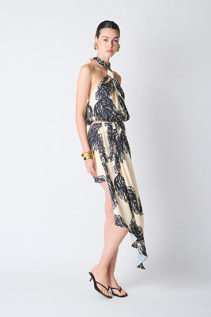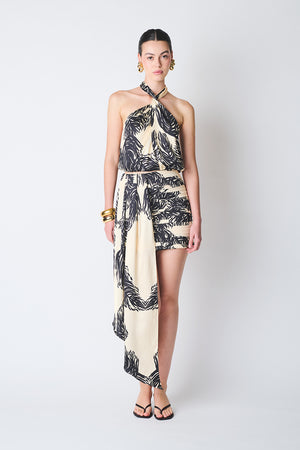 Top de escote cruzado con lazo de amarre en cuello y elástico en espalda y cintura.