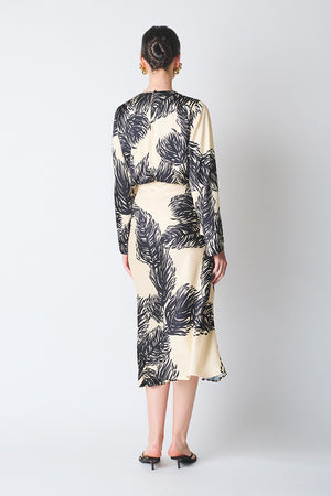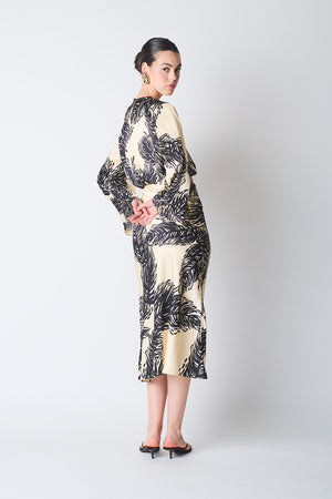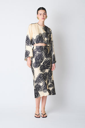 Blusa de cuello alto redondo, manga largas acampanadas, con elástico en cintura, botón forrado en parte posterior del cuello.