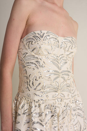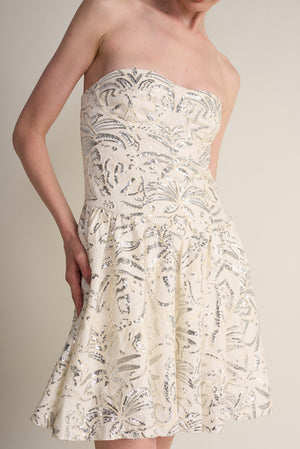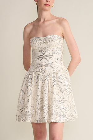 Vestido corto sin tirantes, adornado con bordado en delicadas lentejuelas inspirados en motivos tropicales.